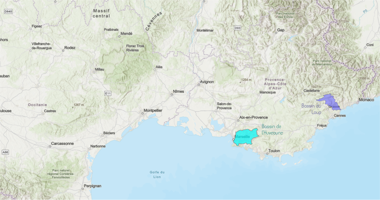 La carte ci-dessous présente les bassins versants instrumentés pour la compréhension de la dynamique de cours d'eau méditerrannéen au regard de leur environnement karstique.