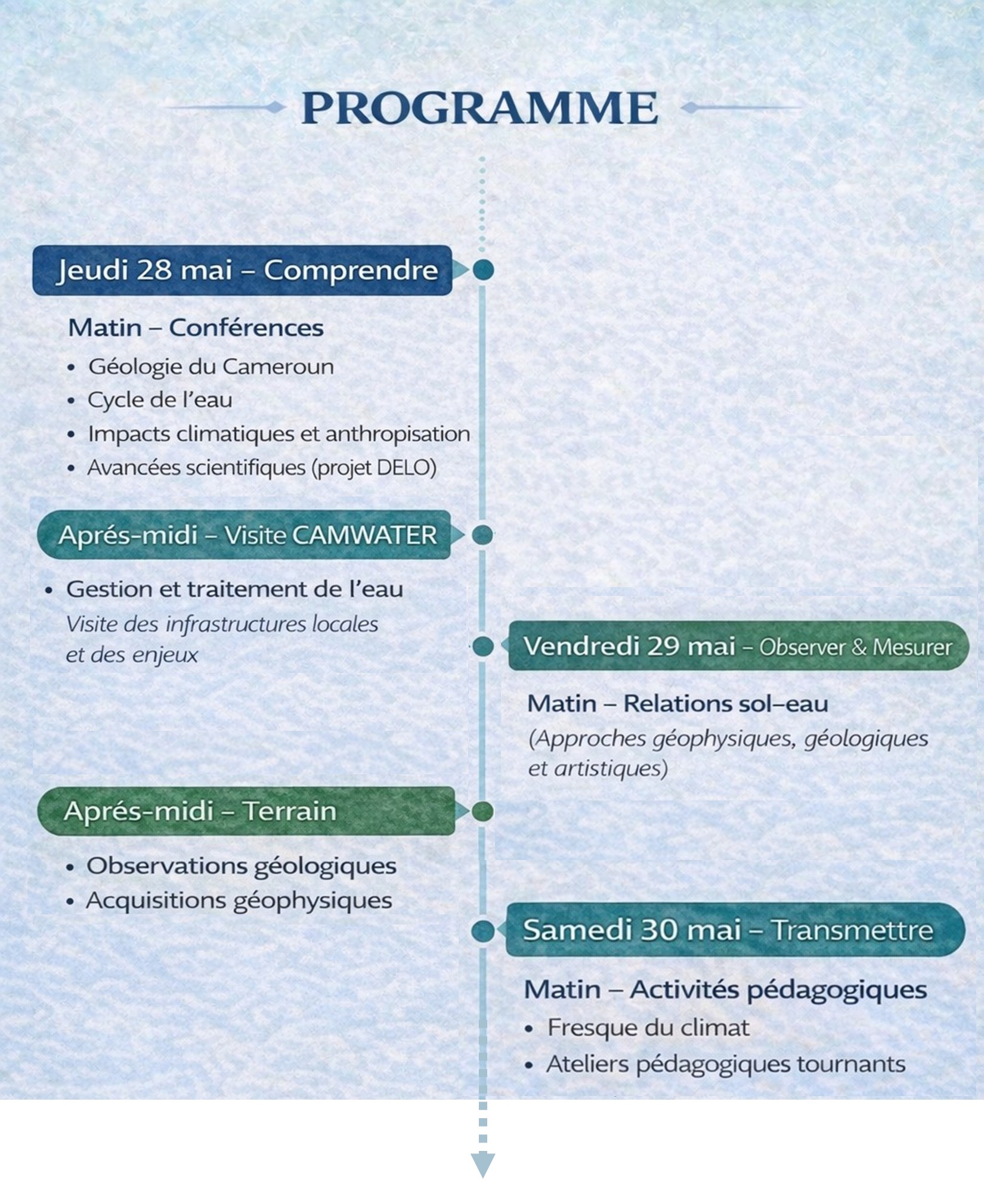 La conférence s’est conclue par une présentation des missions prévues au sein du Club Jeunes pour l’année, mises en perspective avec les différentes étapes du cycle de l’eau. Cette approche a permis de poser des bases solides et de donner aux élèves des repères scientifiques pour approfondir leurs connaissances à travers leurs propres expériences et analyses. Ils seront ainsi amenés à formuler leurs propres questions et à mobiliser des outils pour y répondre.